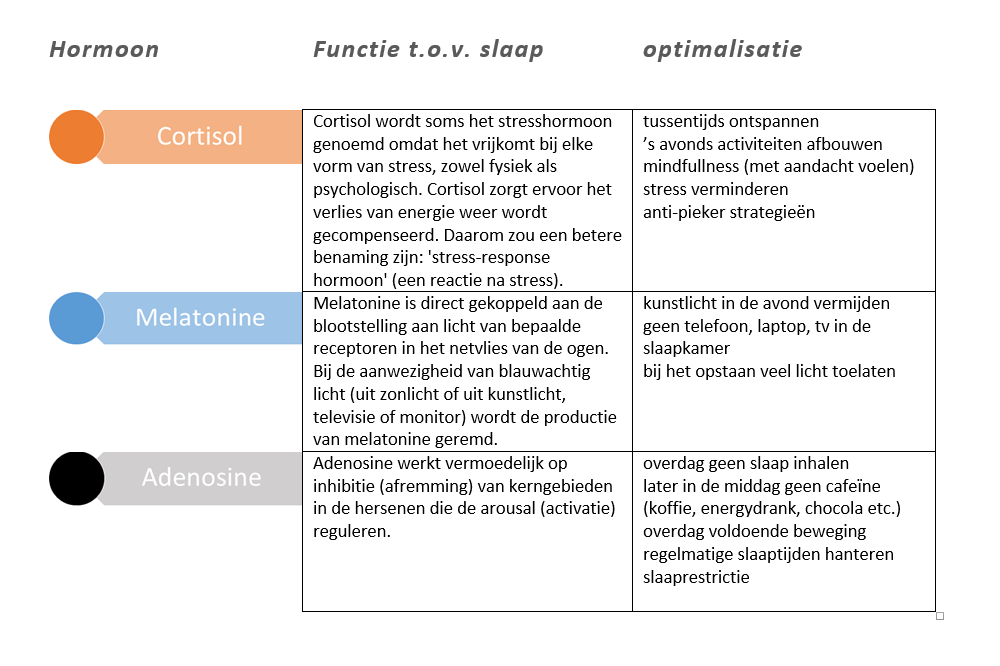 In de fysiovideo over slaap heeft u kunnen zien welke factoren van invloed zijn op een verstoorde slaap en welke destructieve gevolgen dat kan hebben. U ziet dat de slaap hoofdzakelijk gereguleerd wordt door een aantal hormonen die beïnvloed kunnen worden door uw omgeving en uw gedrag. De belangrijkste hormonen voor de slaap zijn Cortisol, Melatonine en Adenosine. In de tabel hieronder ziet u een overzicht van deze hormonen, hun functie tijdens de slaap en welke strategieën hieruit worden afgeleid.